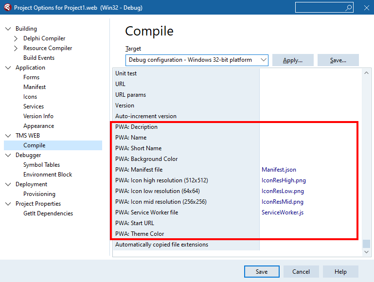 Хотя сгенерированный по умолчанию файл serviceworker.js содержит все функции для автоматического кэширования всего приложения TMS WEB Core для использования в автономном режиме, его можно дополнительно настроить, отредактировав этот файл в JavaScript. Содержимое файла манифеста можно настроить непосредственно из параметров проекта: